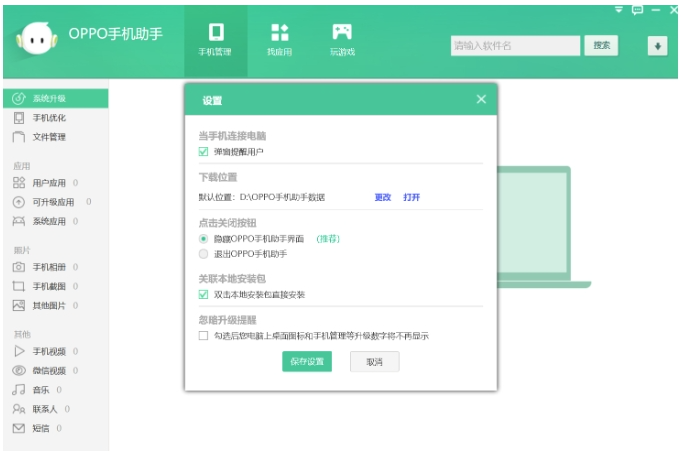 OPPO手机助手简介 OPPO手机助手是OPPO官方为OPPO手机用户管理OPPO手机、realme手机、一加手机专门开发的软件工具,支持一键升级color os、数据线连接电脑还原手机数据设备如照片、音乐、录音、视频、软件等。 软件特色 海量资源:免费获取数十万款应用和游戏,同时凭借最强大的应用搜索功能以及认证系统,帮您获得独一无二的好资源。 高速稳定下载:高速下载爽到爆,服务稳定有保障;更有断点续传,应对一切网络状况。 手机本地资源管理:直观高效的管理您手机上的应用、图片、视频以及音乐文件,支持应用一键升级、文件一键删除。